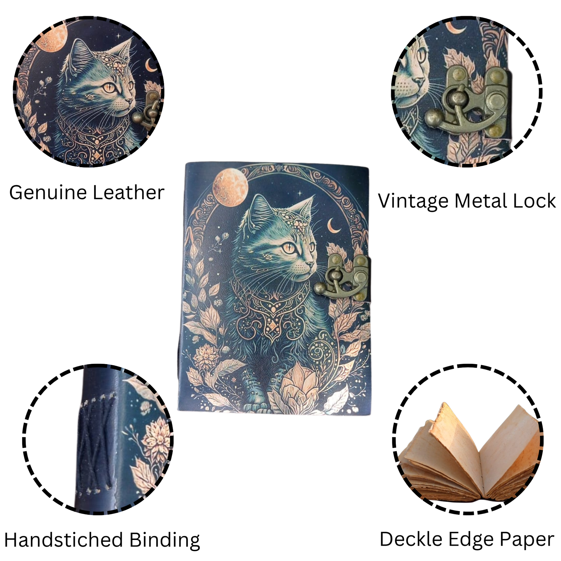 Handicraft Cat Printed Vintage Leather Journal for Men & Women 200 Pages of Antique Handmade Deckle Edge Vintage Paper, Leather Sketchbook, Drawing Journal, Printed Leather Journal, Great Gift