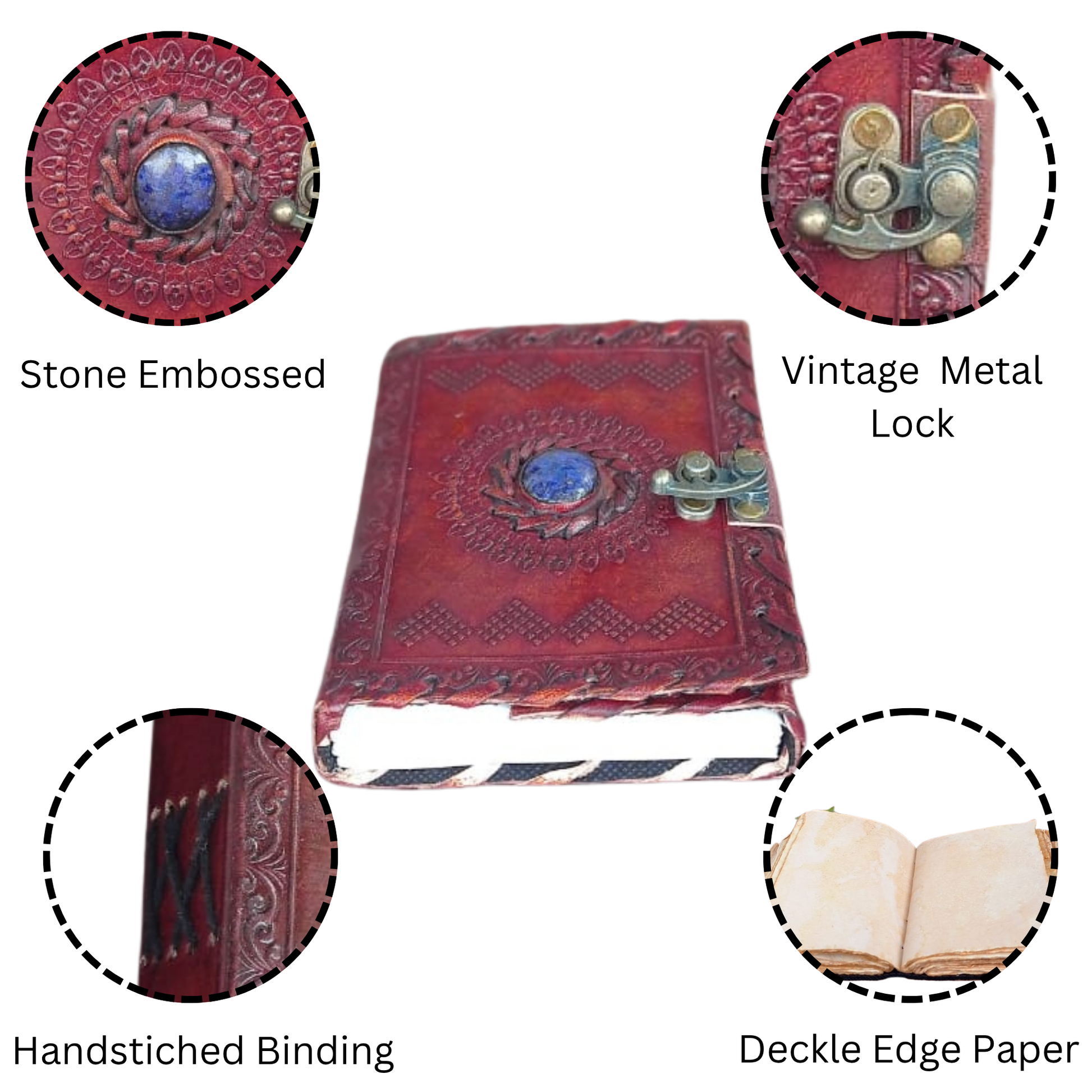 Leather Journal Large Writing Notebook Handmade Bound Vintage Journal For Women & Men with Lock/Semi-Precious Stone Gift For Art Sketchbook (7 x 5 Inches)