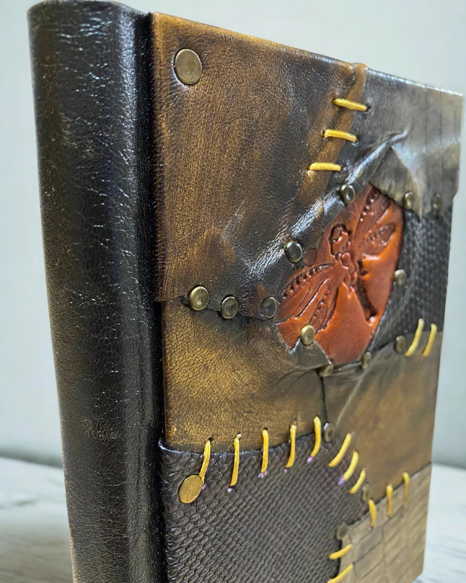 Unleash your creativity with this one-of-a-kind handmade leather journal. Featuring a rustic patchwork design and an embossed dragonfly motif, this notebook combines craftsmanship and character – perfect for artists, writers, or lovers of all things steampunk.
