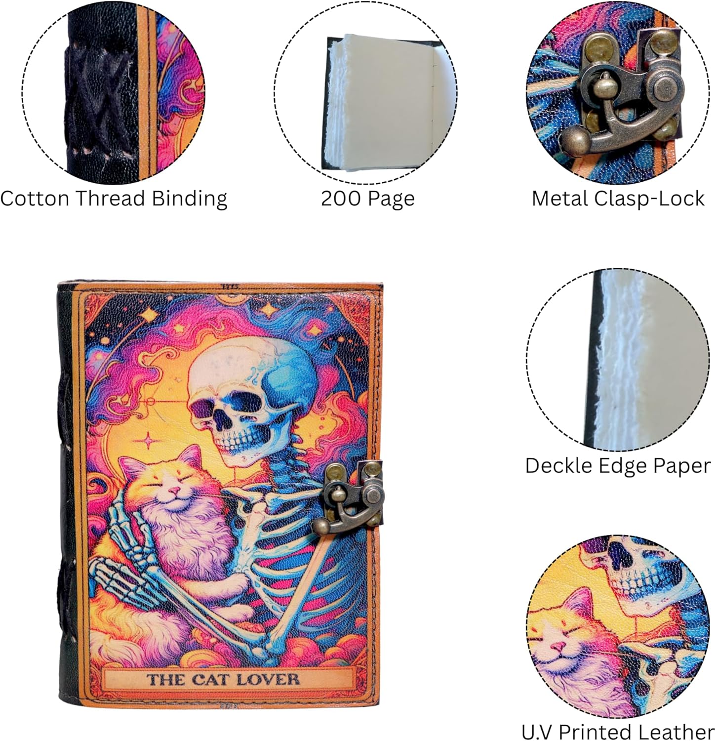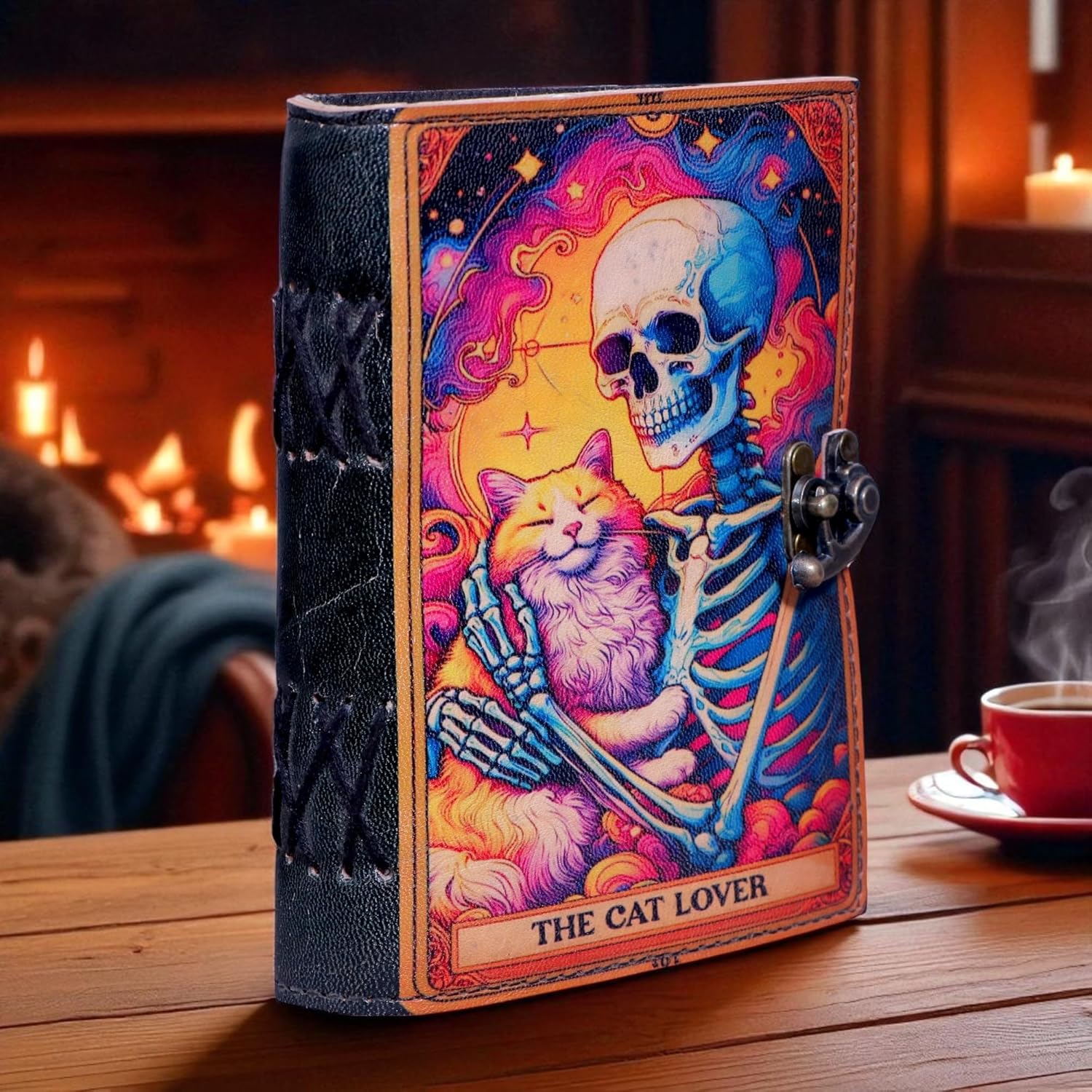 - Unique Gothic Cat Lover Design – Featuring a vibrant, mystical cover illustration of a skeleton hugging a cat, this leather diary blends gothic, fantasy, and bohemian art. A must-have cat lover leather notebook, perfect for gothic stationery collectors, fantasy art fans, witches, and occult enthusiasts.